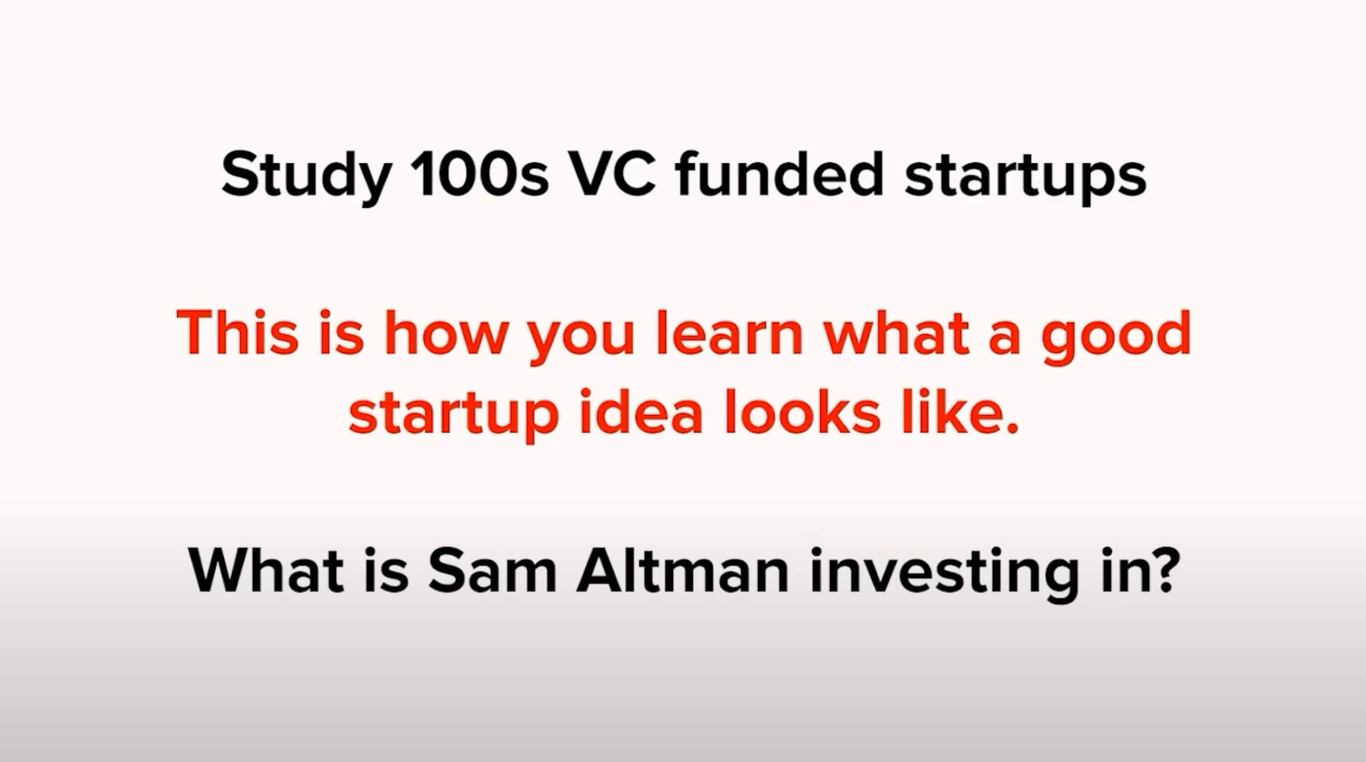 A smart way to approach this is to study at least 100 VC-funded startups, probably more—more like a thousand startups if you can. This is how you get a sense for what a good startup idea looks like. One good way to go about it is to find the world’s best investors, like Sam Altman, and take a look at what they're investing in.