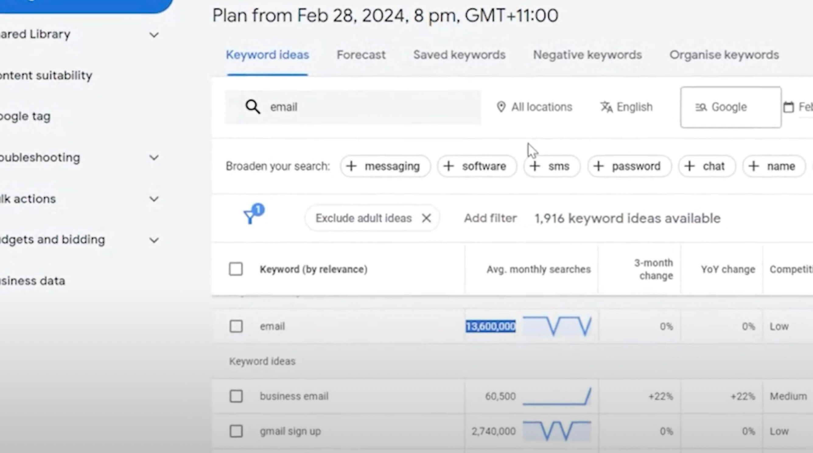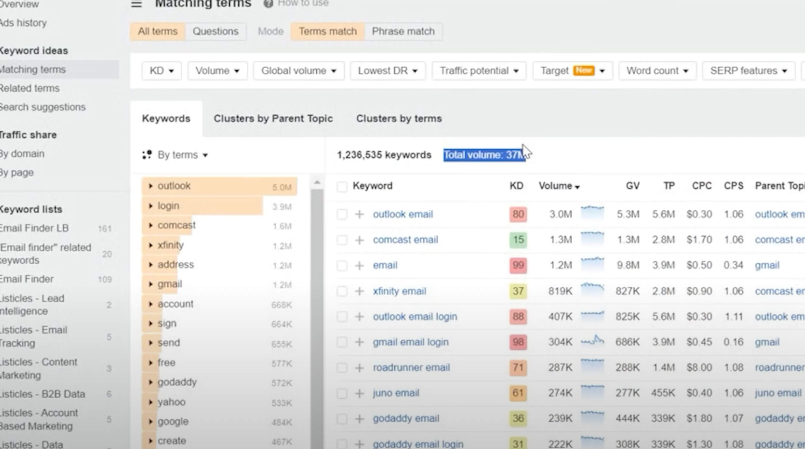 Also, Google only gives you the search volumes for the keyword by itself, "email," whereas Ahrefs will give you the keyword volume for all other terms that contain your main keyword "email" in my case."