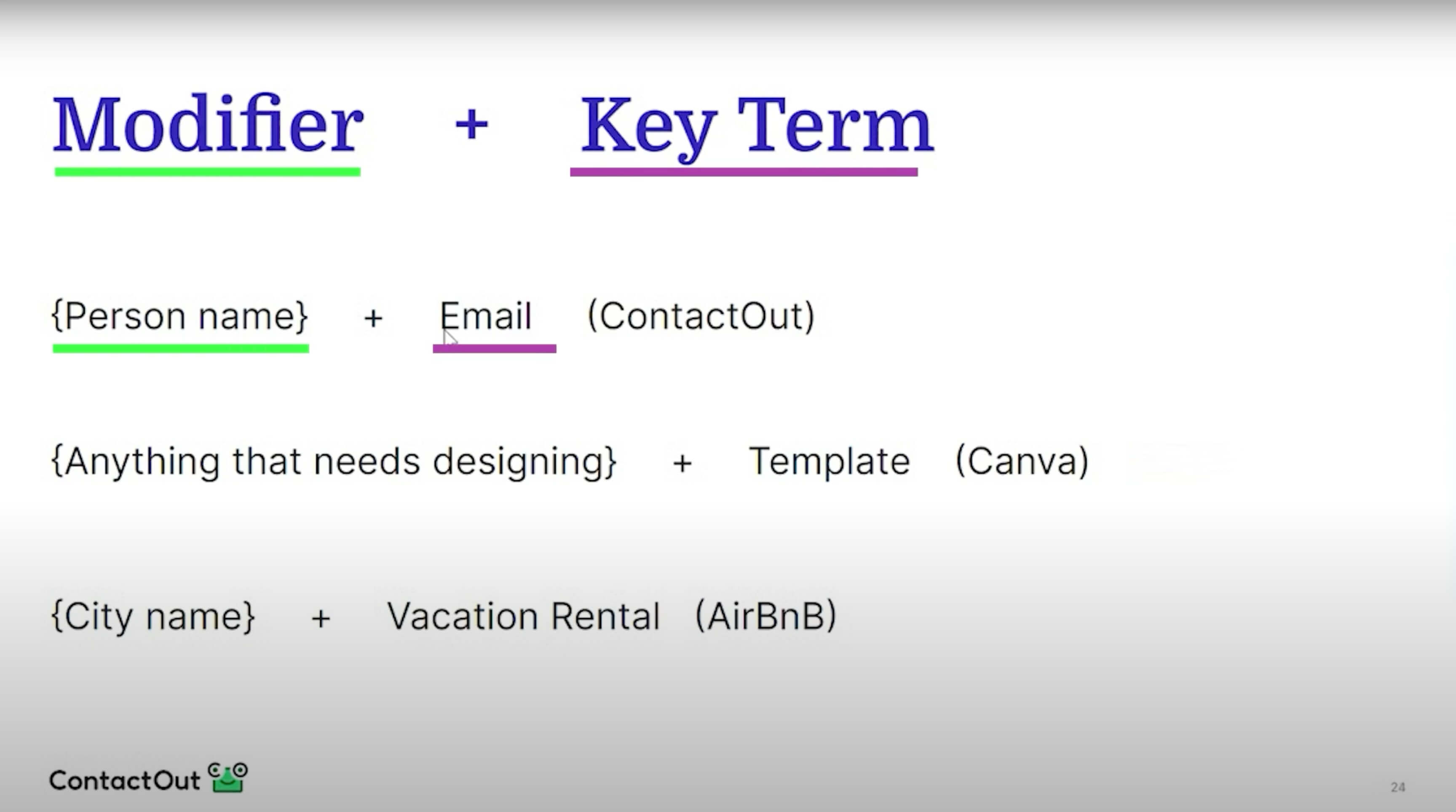 A keyword consists of a modifier and a key term, for example, person name + email or in Airbnb's case, a location + vacation rental.
