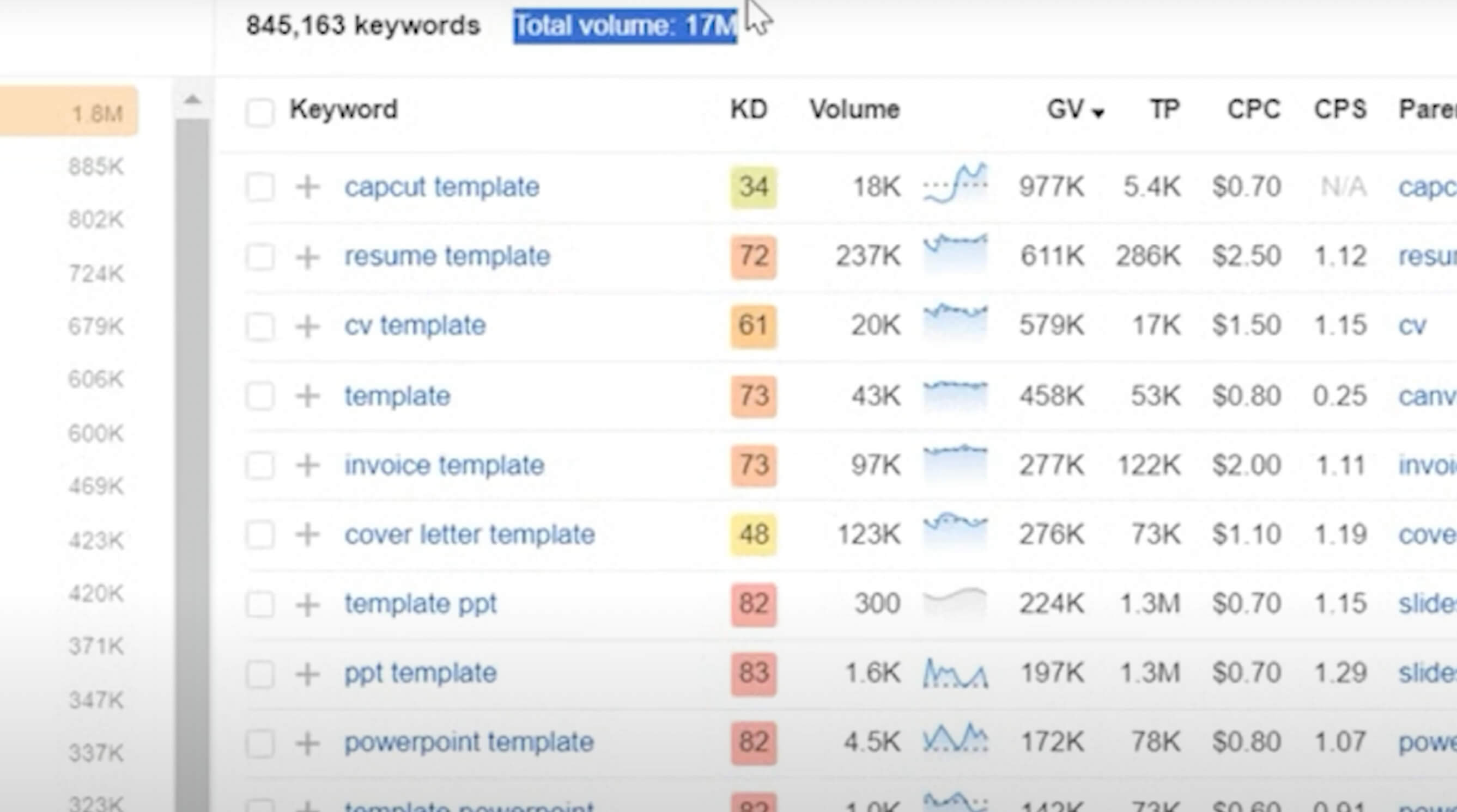The next thing to check is the traffic volume. ContactOut's key term "email" gets 37 million searches per month and Canva's key term "template" gets 17 million searches per month.