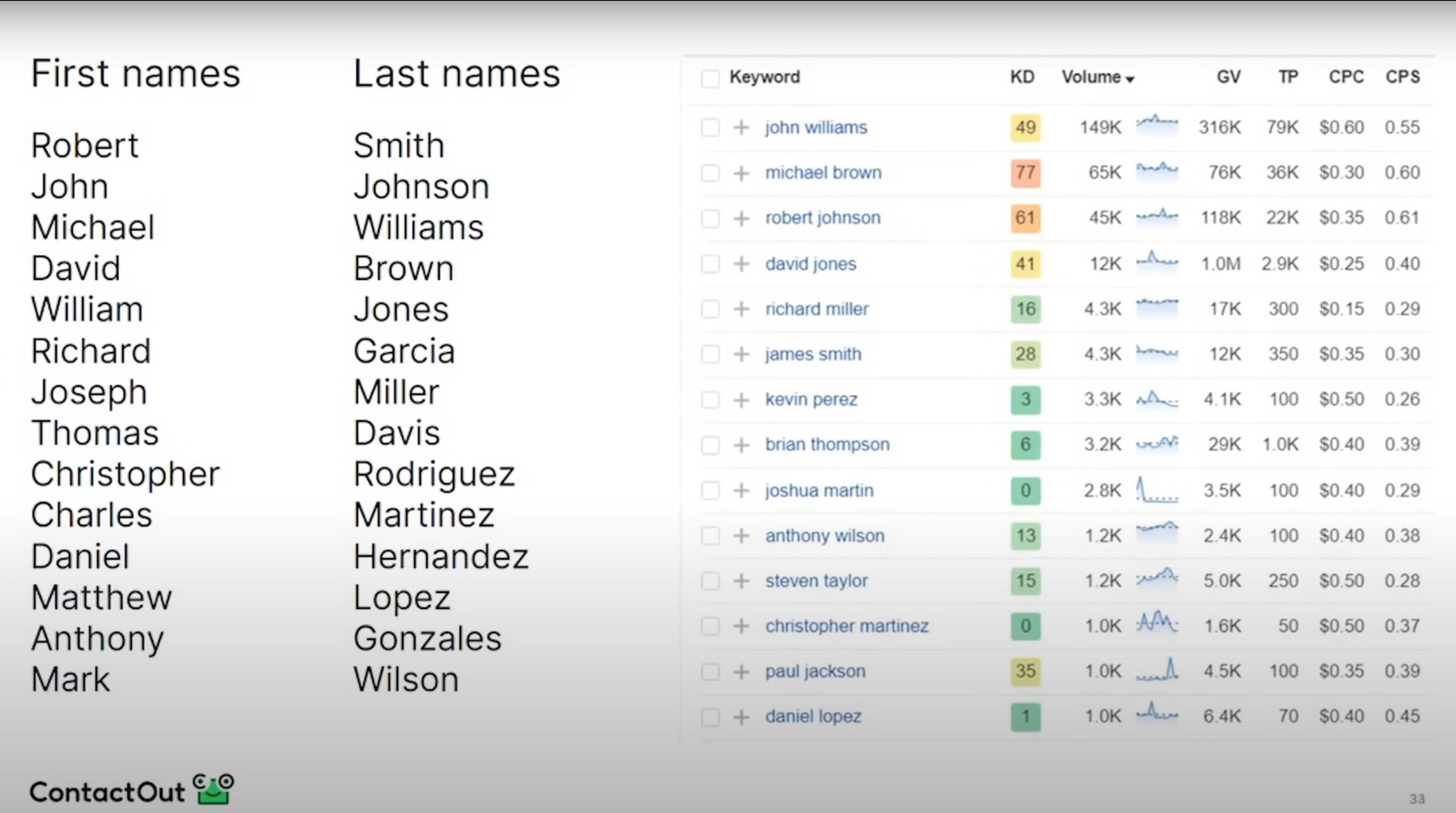 The next step is to find modifiers with high traffic. For example, in ContactOut's case, we were targeting person name + email. We want to find people's names that are really popular and have a lot of traffic, so lots of people will search for their email.