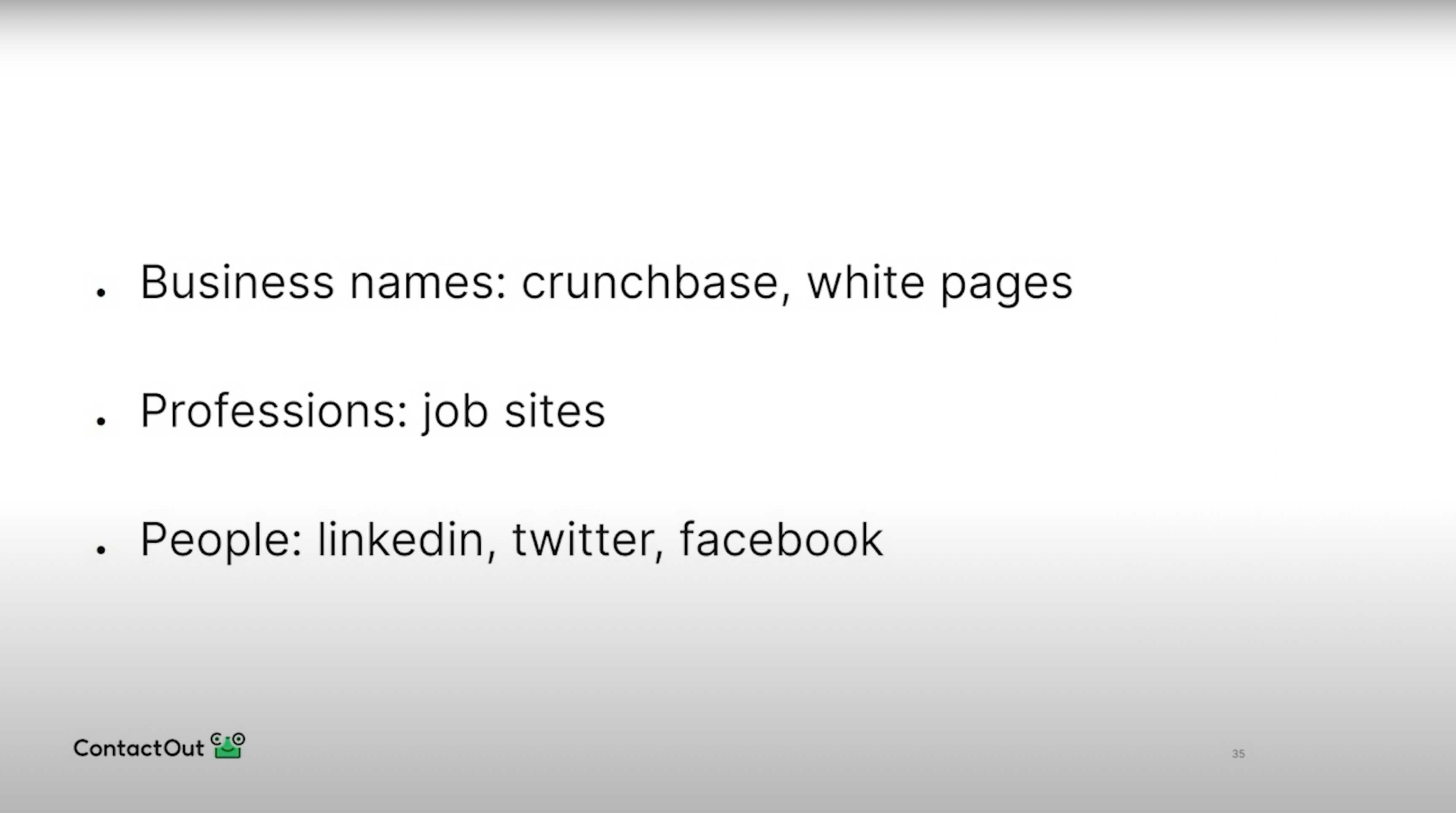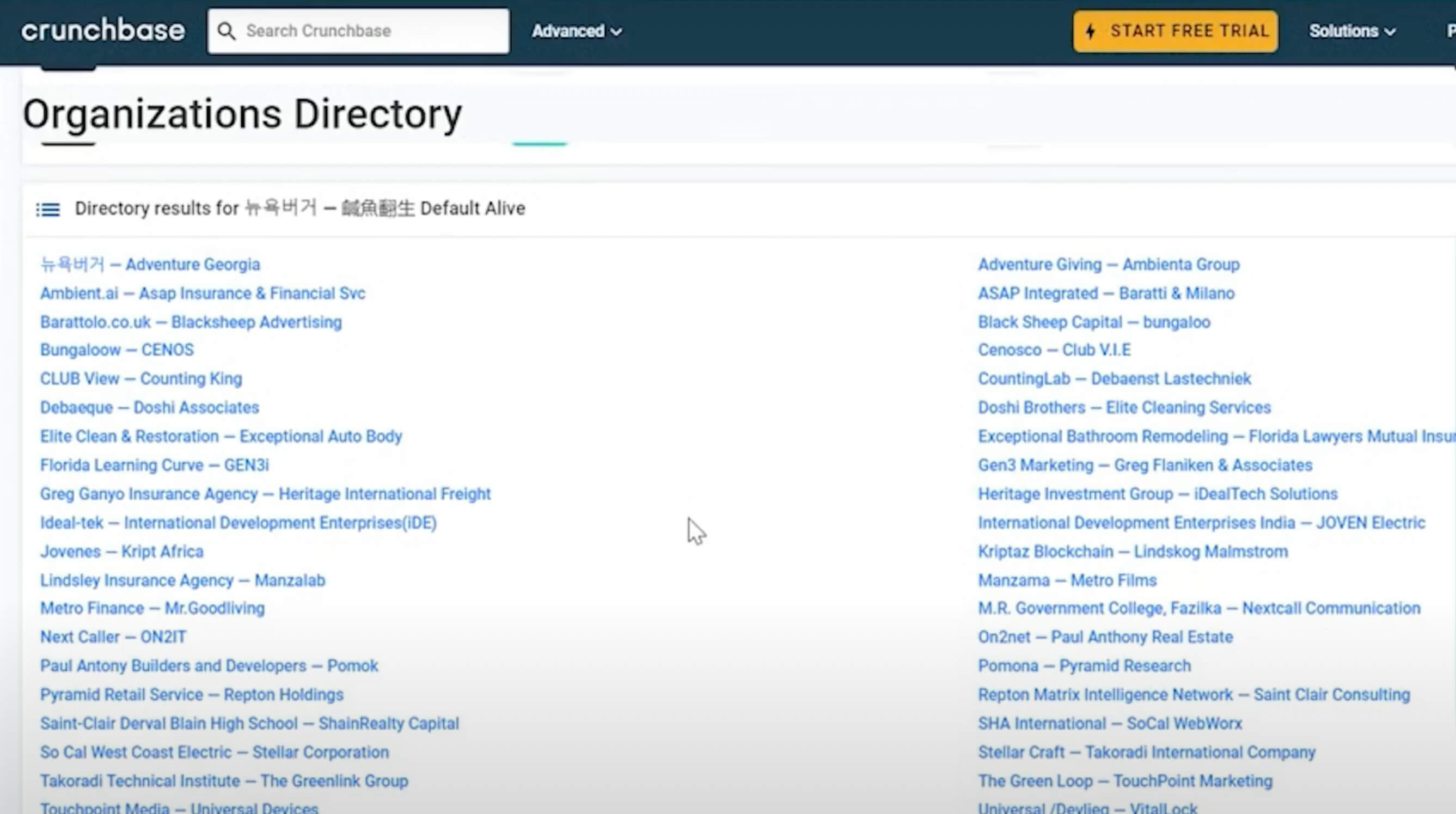 Crunchbase, where they will give you a list of all the businesses that you can check, or Whitepages if you're looking for a list of professions.