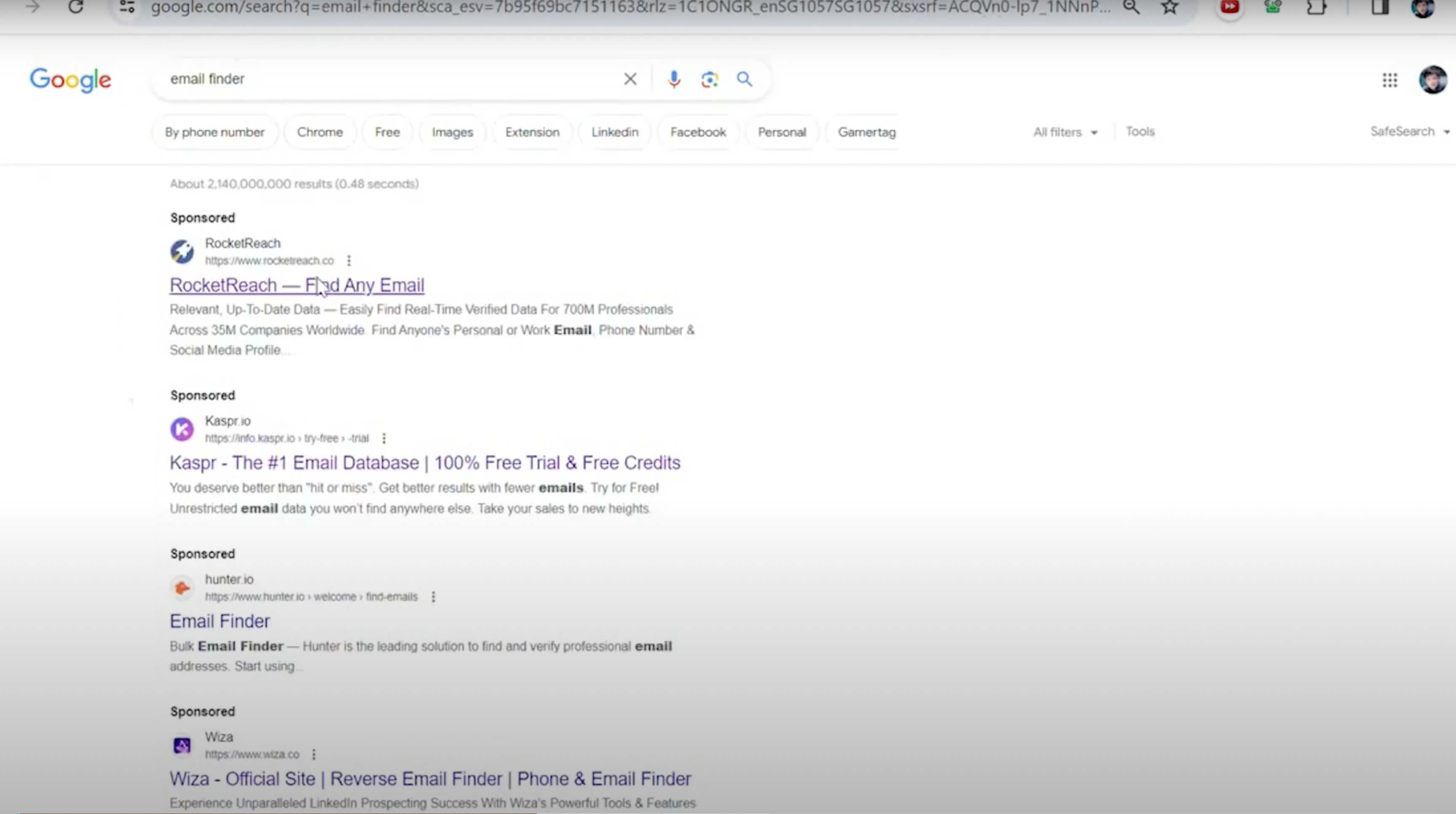 For example, the main keyword we target, like "email finder," all the pages on the first page only have a few thousand pages in total. Our competitors that have millions of pages — like, you know, RocketReach, Lusha, Apollo — none of them are ranking on this page even though they are actually the most popular tools.