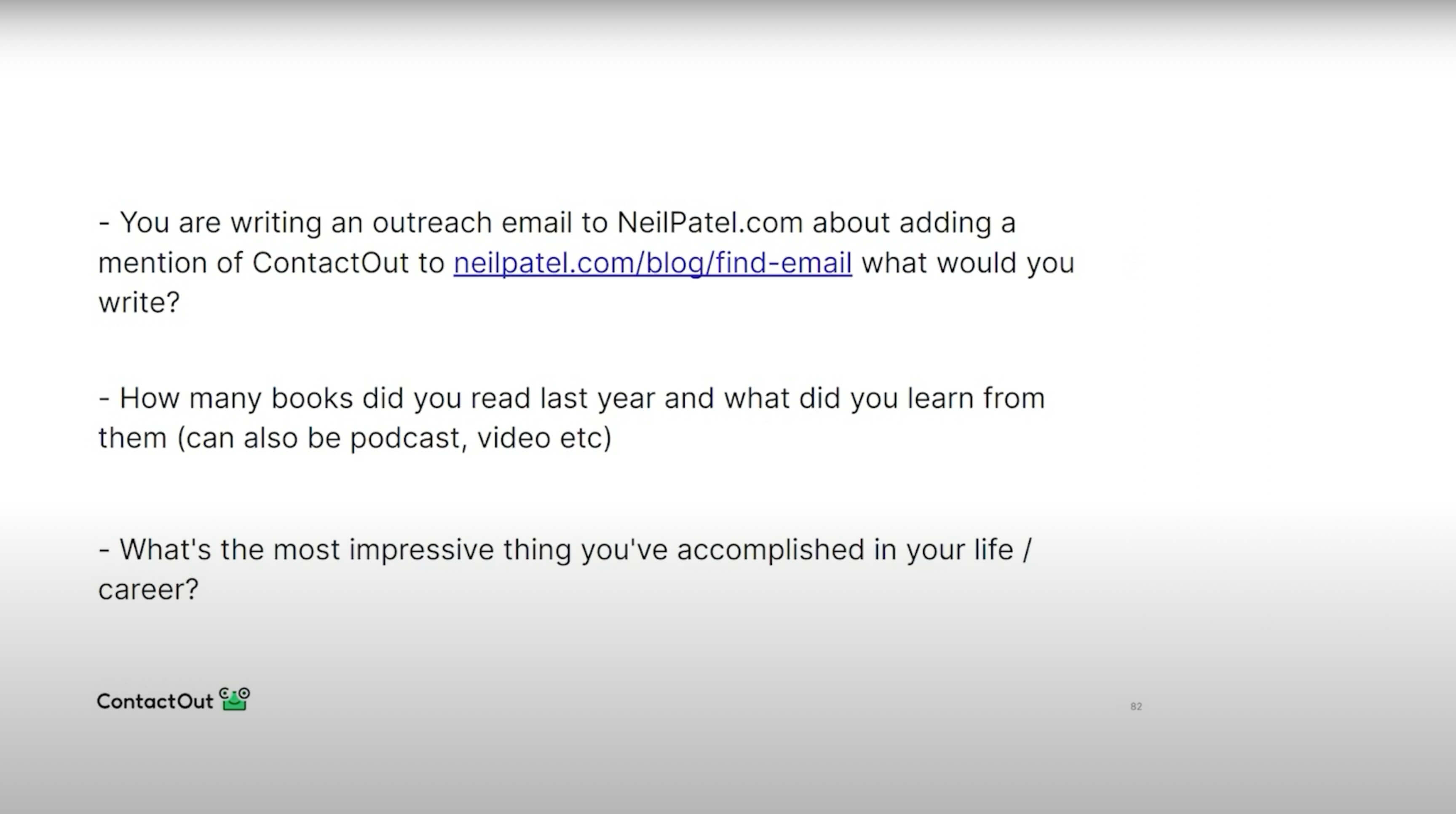 I like to ask some standard questions, like, “Hey, you’re writing an outreach email to Neil Patel, for example, on his blog, and he has an article about email finders or finding emails. What would you write to ask that ContactOut be included in his review of tools that find emails?