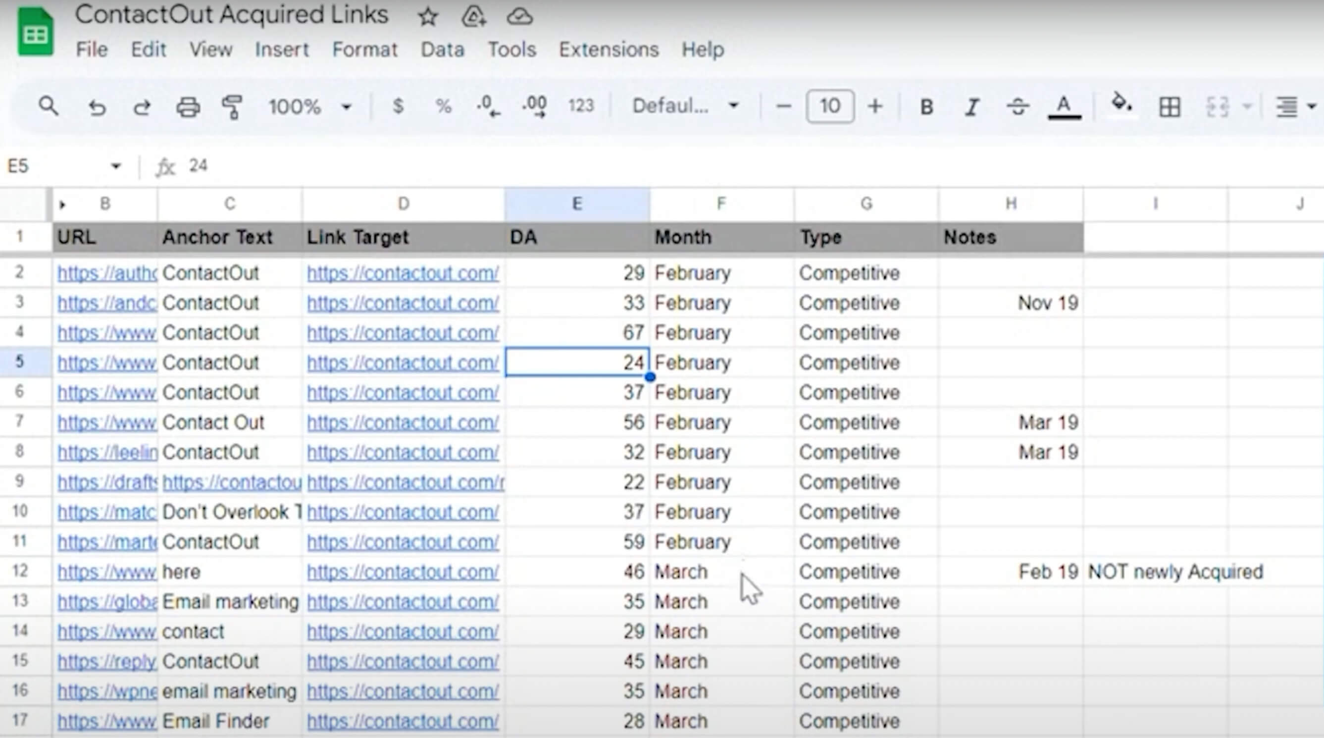 This is our link-building tracker where the team will just put the links that we built, what the domain authority is, when they were built, etc.