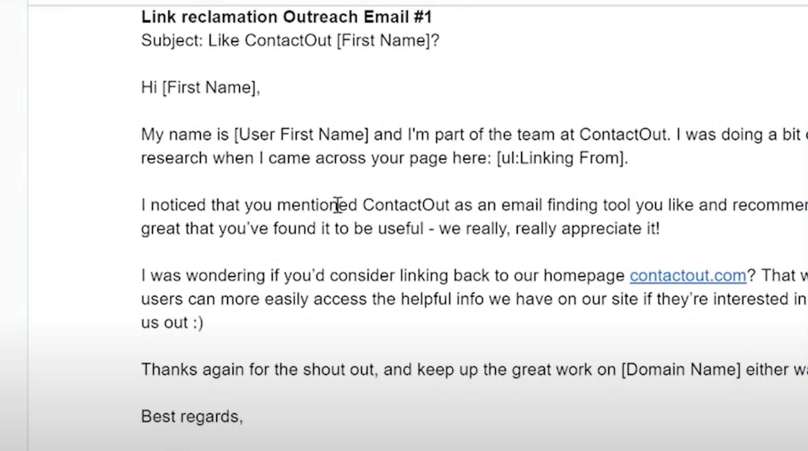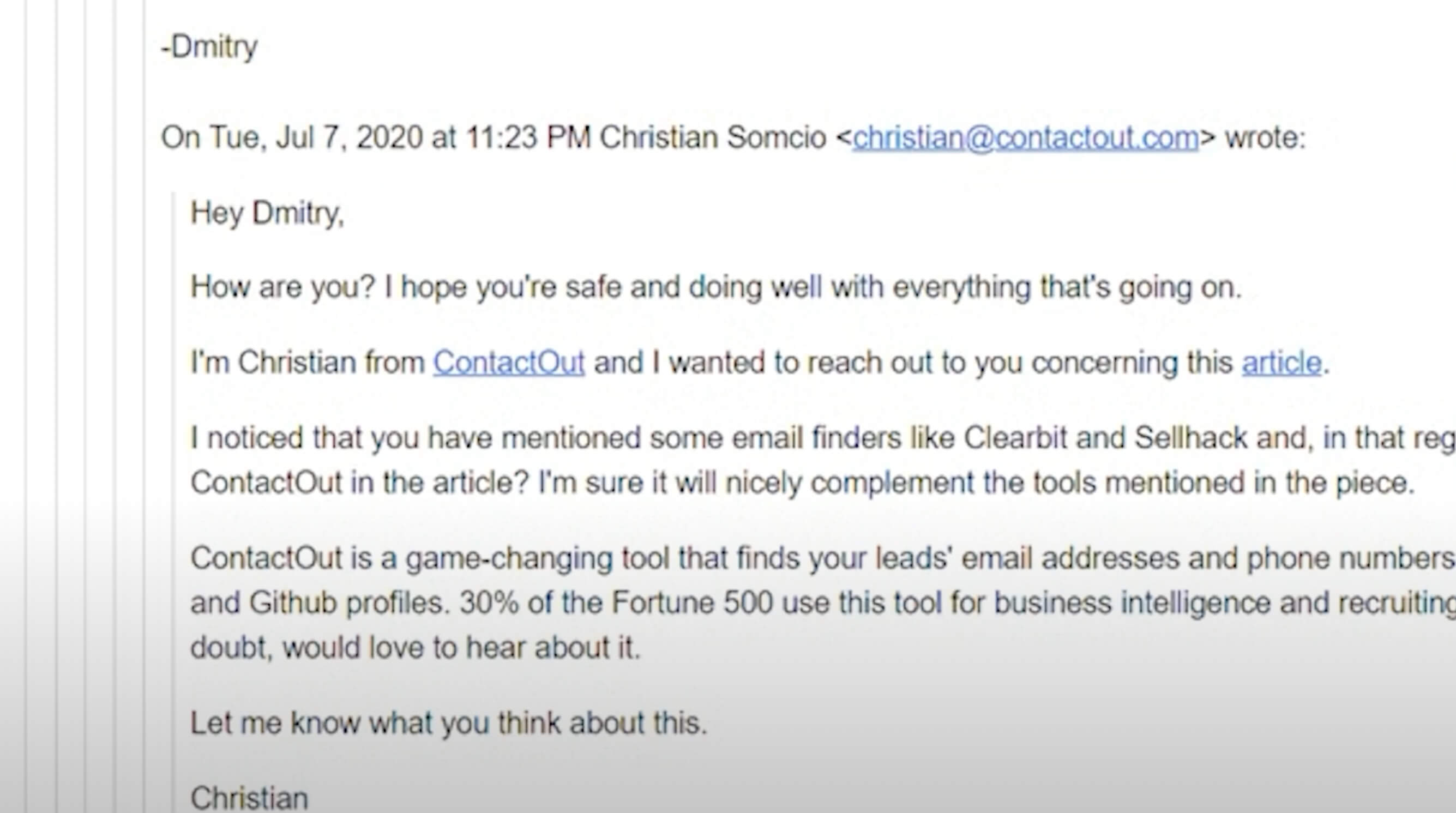 Here’s another example outreach: 'Hey Demetri, you know you’ve mentioned these other tools like Clearbit and Sell Hack in your article. Here’s a bit about ContactOut. It would be great to hear your thoughts on us, and if you check us out, consider adding us to the article.' Then I think Demetri is like, 'Hey, do you have a budget for advertising?' and we’re like, 'No, I guess Google doesn’t like people buying links.'