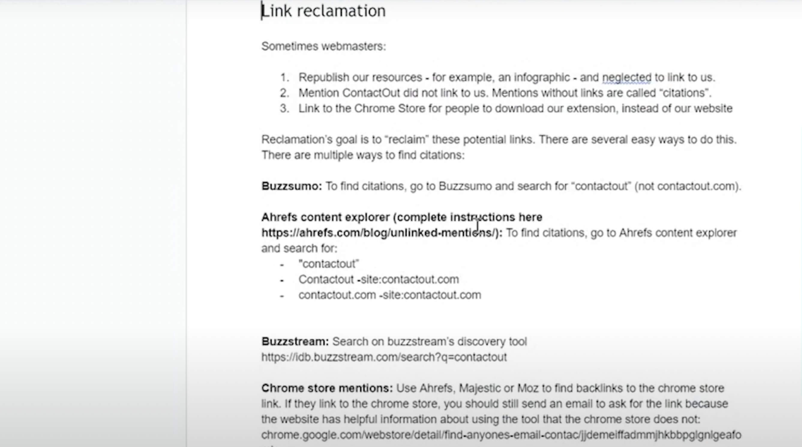 Here’s some example documentation about our process that we give to our team for link building. This is for brand mentions, where we search for people that have mentioned ContactOut on their sites. Then, you know, we filter the domain authority of these.