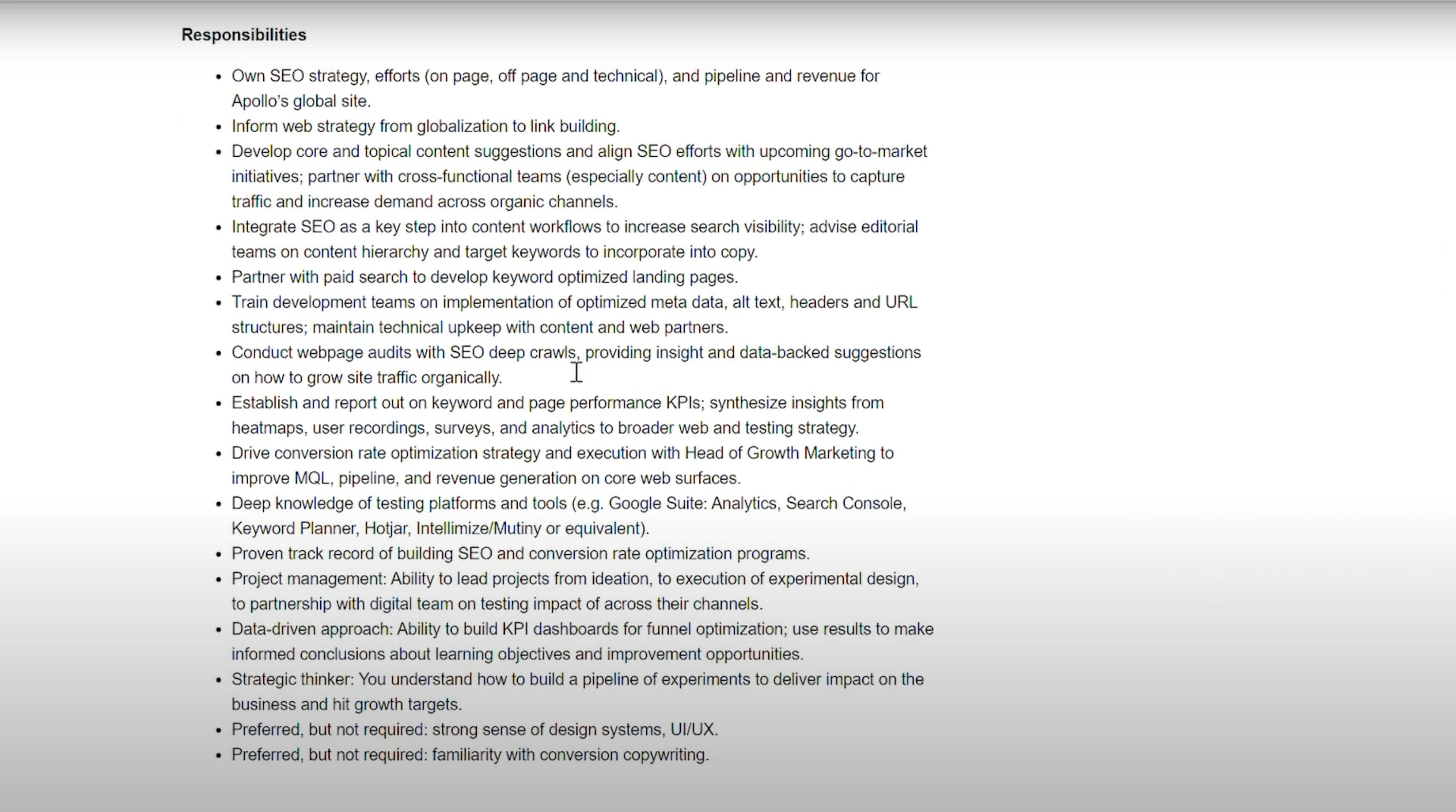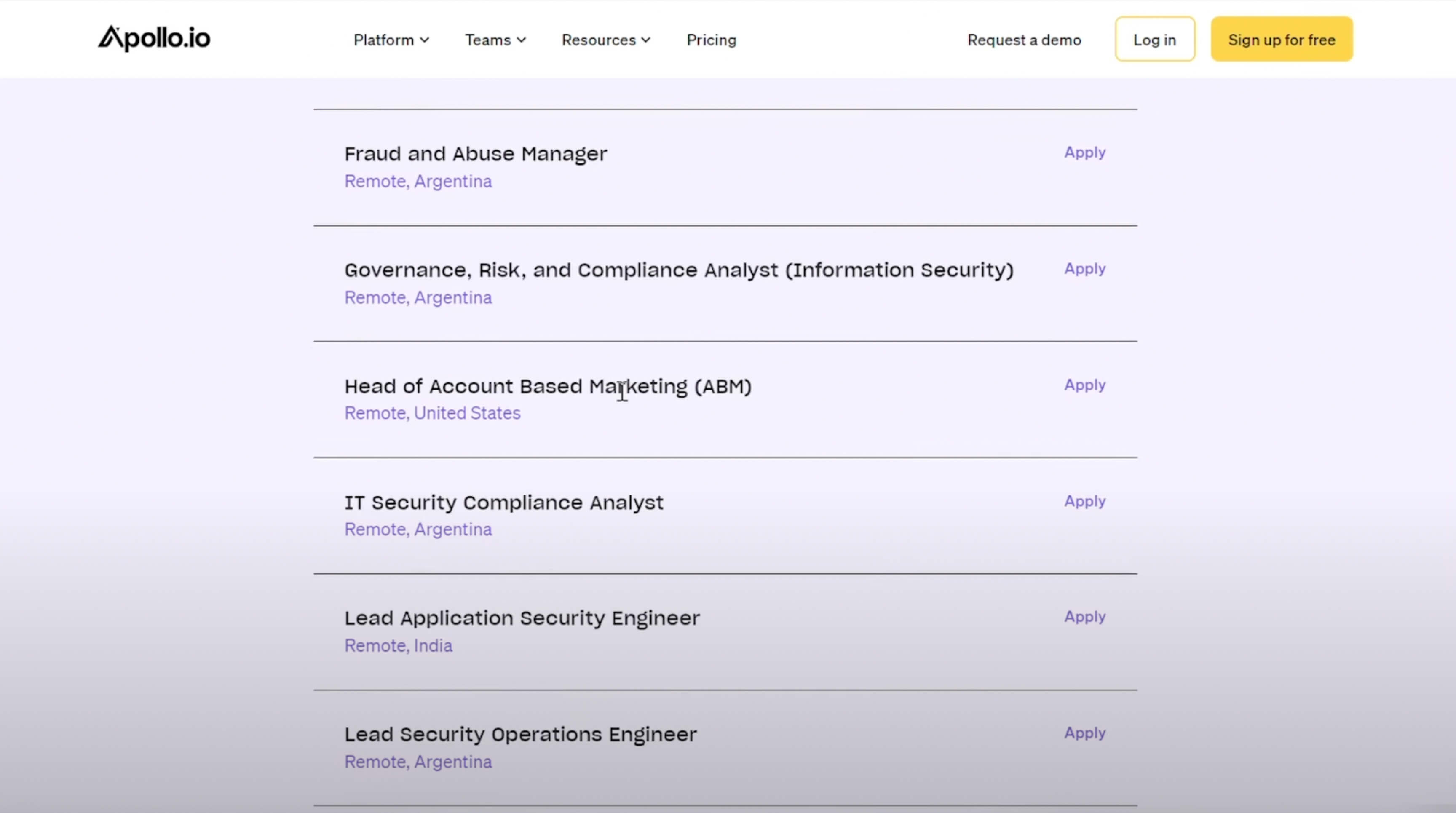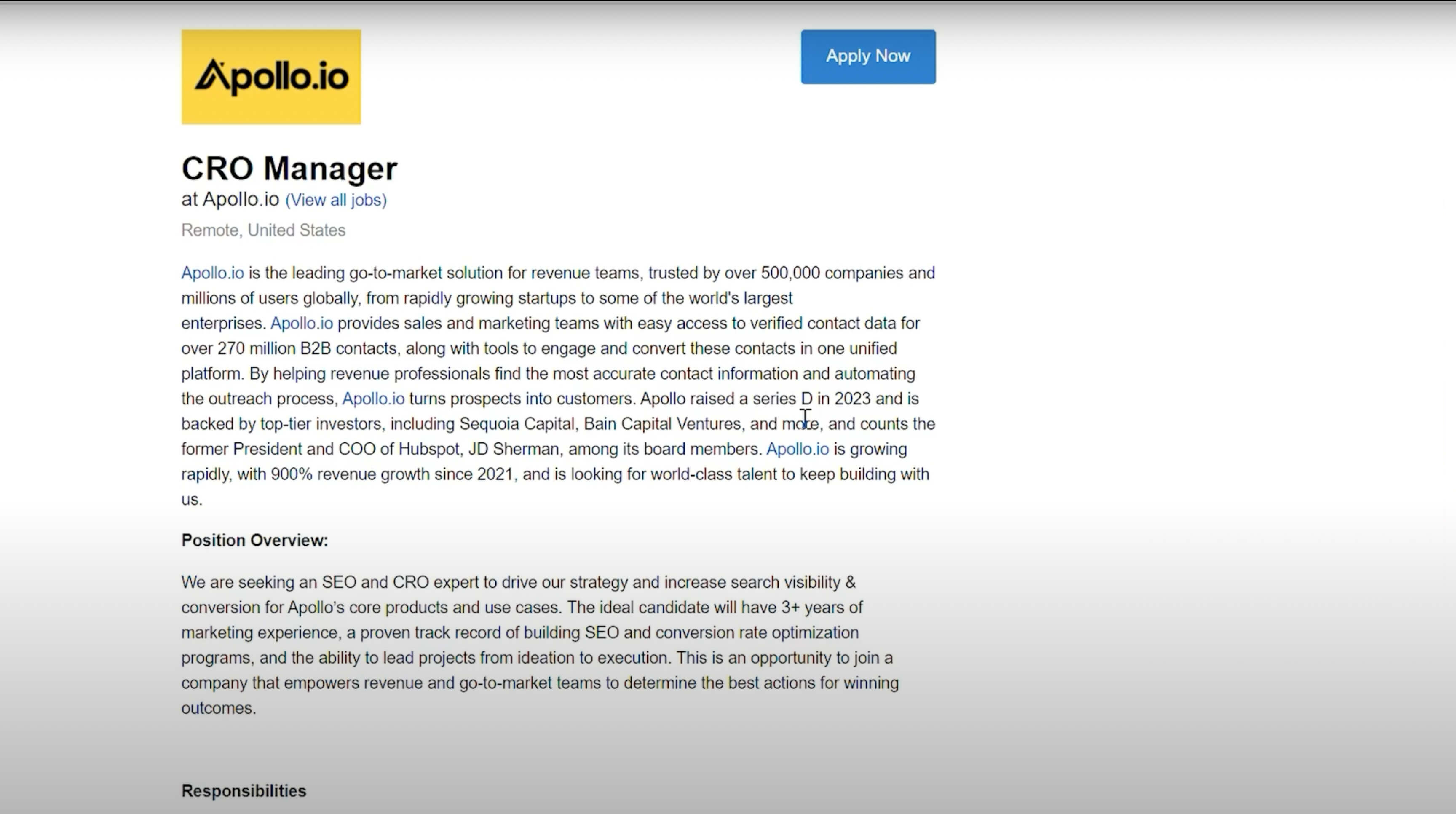 So looking at Apollo’s jobs posts, you can see that they have open jobs for SEO strategy, account management, security and compliance. These are probably areas that Apollo is focused on strategically.